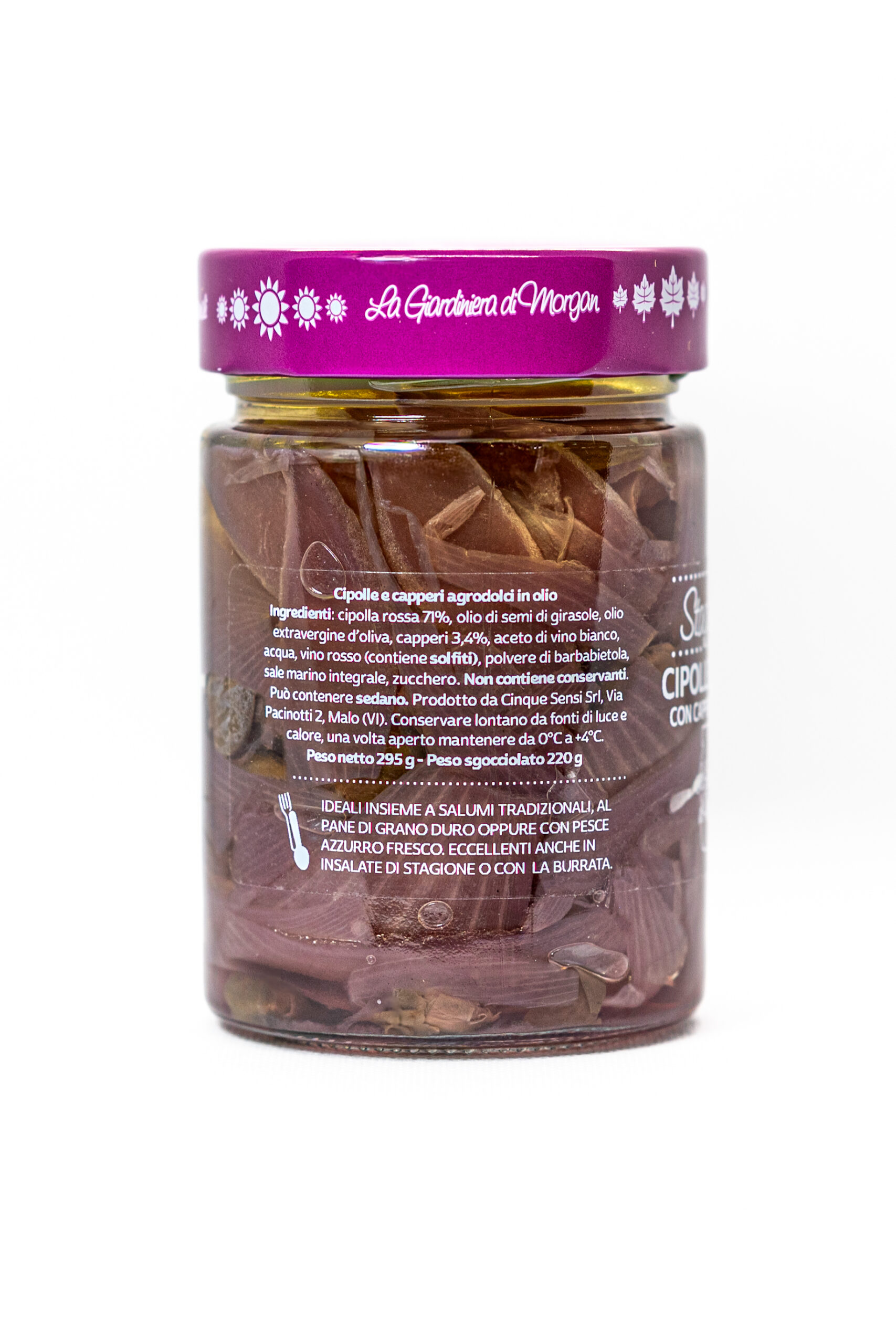 The Purple Onions from La Giardiniera di Morgan have been marinated in a mix of vinegar and oil. They offer a savory and inviting flavor, enriched by the well-known saltiness of Sicilian capers that makes the perfect balance in taste. Ideal with cured meats, durum wheat bread and fresh oily fish, it is also excellent in seasonal salads or paired with burrata.
