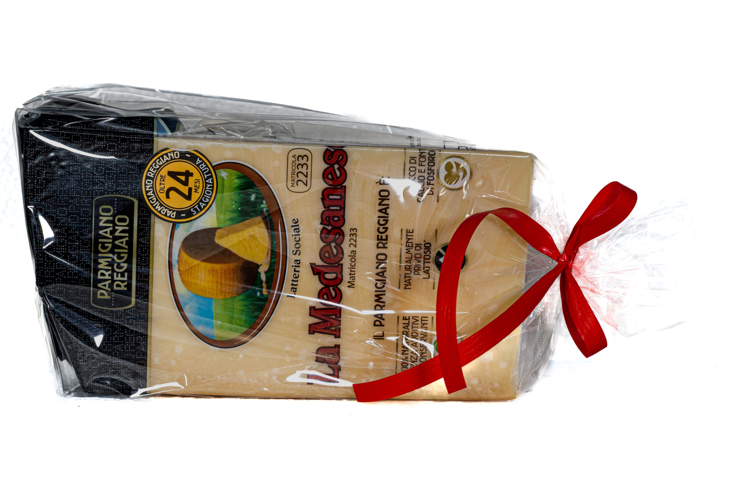 Parmigiano Reggiano DOP cheese aged over 24 months from La Medesanese company, 100% natural, without additives and preserved. Lactose-free.